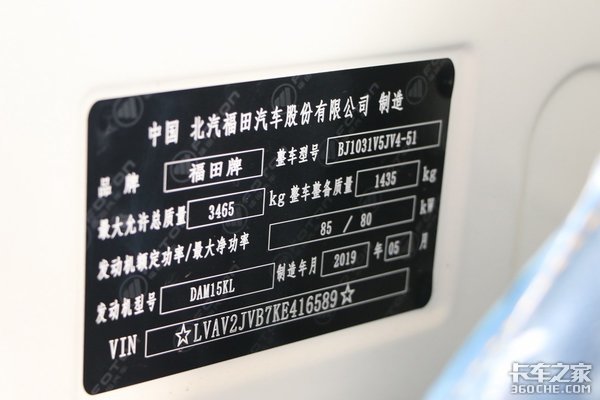 根据车辆上的铭牌可以看到,整个车辆总重为3465kg,而车辆的整备质量为1435kg,这样计算下来,在法规允许的范围内,祥菱M1的可装载重量大约在1.9吨左右,这个数据在目前微卡市场中还是很有竞争力的。
