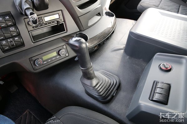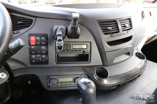 中控台采用的是半环绕式设计,主车和挂车的手刹都布置在了中控上,除此之外,多媒体和空调的控制按钮、灯光、差速锁等都位于中控上,方便驾驶员随时进行操作。