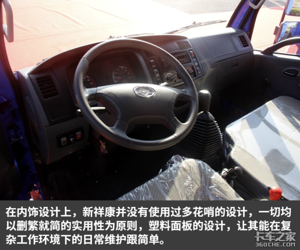 作为一辆工程车,需要经常出入粉尘环境,所以简单而实用的设计是应对该类环境最优的选择,日常维护更省心简单的同时,新祥康的内饰设计在同级别的车型里,还是带有一定设计感的。
