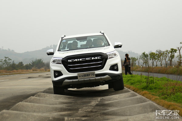 经过双侧交叉凸起路面时,长安凯程F70的通过性能得以展现,较长的减震行程配合较快的弹簧回弹速度,能够让车辆保持较为稳定的姿态和线路前进。