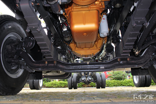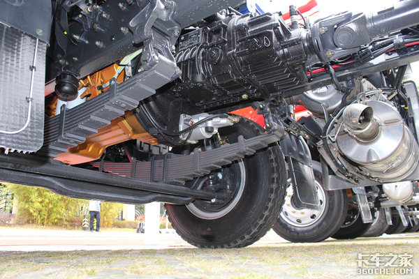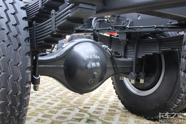 后桥速比为4.364,根据变速箱和后桥速比得知该车型总速比为3.45,低速扭矩和高速行驶兼顾的选择,12+9片板簧确保承载力,另外后桥采用长换油技术,确保了使用的长效性,卡友进出服务站的次数也随之减少。