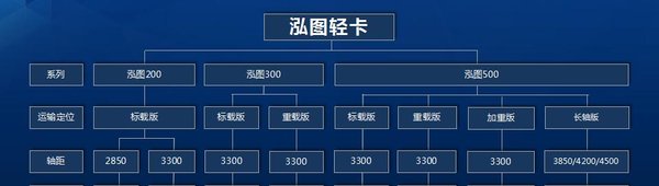 按尺寸分,泓图共有三种驾驶室,泓图200宽度尺寸1735mm,属于窄体驾驶室;泓图300宽度尺寸1880mm,属于中体驾驶室;泓图500宽度尺寸2080,属于宽体驾驶室;泓图EV宽度尺寸1800mm,和泓图300一致。参数表现和同级车型处于同一区间。更值得一提的是,泓图全系车型目前共有10款动力覆盖,几乎涵盖了目前所有用户主流消费者需求。