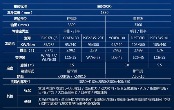在动力部分,泓图300目前有江西五十铃2.8,云内2.5、3.0,康明斯2.8、3.8等发动机可选,匹配万里扬5挡、6挡,六安5挡、六安6挡多款变速箱,和3.5吨、5吨及5.5吨级别后桥。全系标配气刹配置。