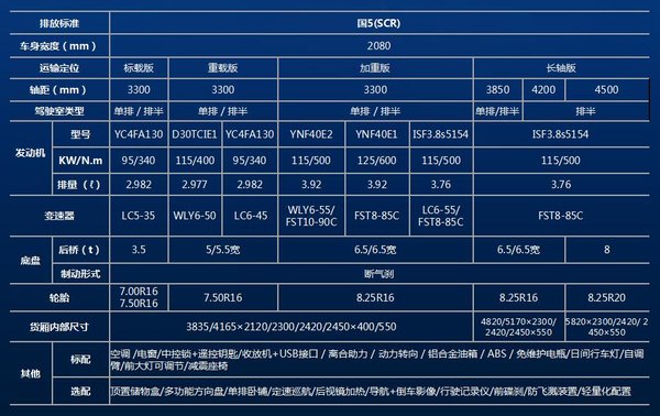 泓图500宽体车型轴距覆盖3300-4500mm,主要面向中长距离的城镇和城际物流运输,有蓝牌标载版,黄牌重载版、加重版和长轴版车型,是整个家族中配置最丰富的车型。