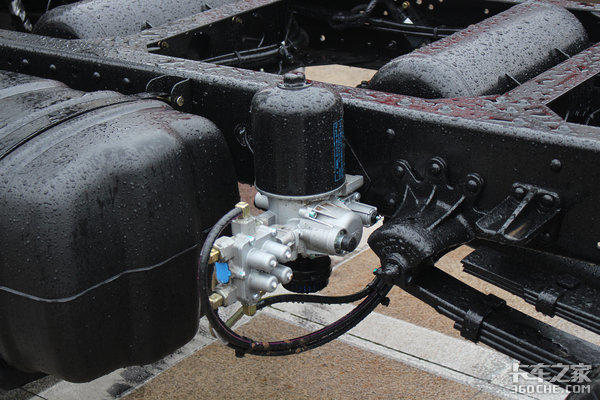 实拍车采用瑞立牌空气处理单元,作为商用车主流的空气处理单元供应商,瑞立的可靠性毋庸置疑。目前很多轻卡车型空气处理单元都设置在大梁内部,而解放轻卡则是放置于大梁外侧,这样便于检查、更换维修。