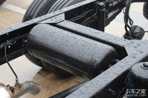 实拍车采用气刹制动,整车2个储气罐被布置于车架之间,呈前后排列,可节省底盘外部空间,使得后期加装工具箱就变得很方便。