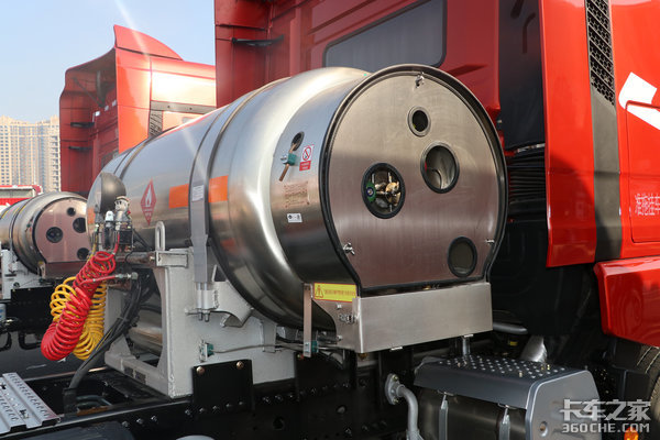 实拍车搭载1000L不锈钢单气瓶,满足车辆的长续航定位需求,此外为降低车身自重,LNG气瓶固定底座采用铝合金材质。