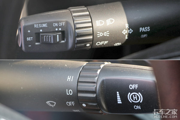 方向盘后组合开关集成多种功能,左侧组合开关为定速巡航和灯光控制开关,右侧为雨刷器和液力缓速器控制开关。