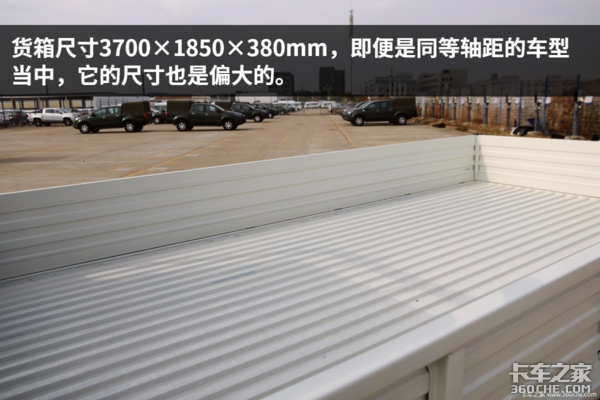 而货箱尺寸方面,这款车的尺寸为3700×1850×380mm,即便是同等轴距的车型当中,它的尺寸也是偏大的。所以说,在满足“城市道路自由穿梭”的前提下,这款车在“装载量”这个指标上非常突出。