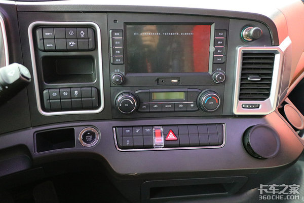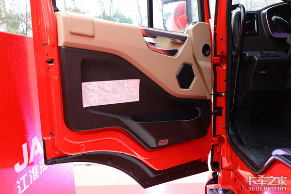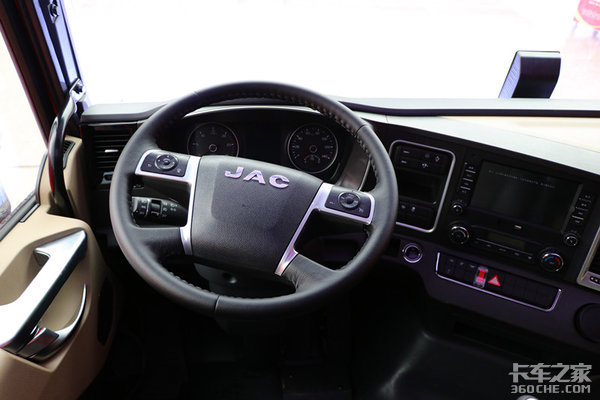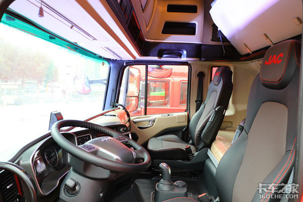 驾驶室采用平地板设计,使得内部空间更为宽敞,内高达到1960mm,高个子在里面也能不低头不弯腰,活动自如;整体以米色和深灰色为主,撞色的设计让人眼前一亮。