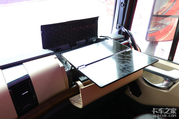 副驾驶前面的工作台配有隐藏的小桌板,平常吃饭、放置东西、或者维修小零件都可以在这里进行,很方便。