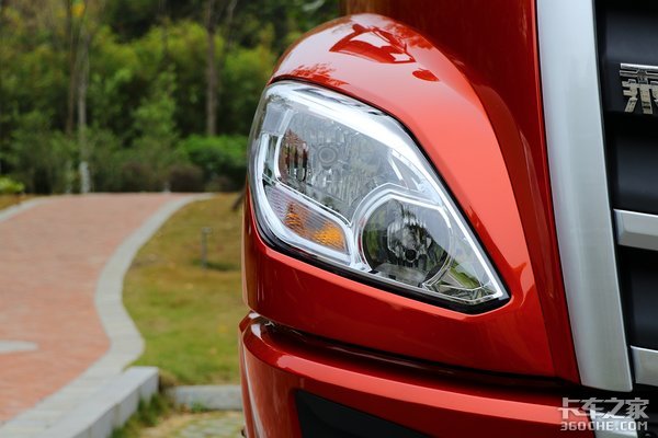 高顶双卧驾驶室,驾驶室顶部带有示廓灯,黑色的遮阳板可以减少阳关对于驾驶员视线的干扰,遮阳板中部还保留了此前部分重卡上速度灯的设计。