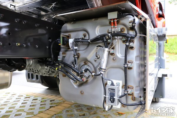 蓄电池和后处理系统位于车辆的右侧,可以看到升级为国六阶段之后,后处理部分的体积变大,传感器也增加了不少,对于卡友们未来的用车要求也会更高。