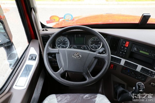 整个中控依然是和国内重卡的主流设计相同,呈半环绕状靠近驾驶员一侧,方向盘采用的是普通四副式方向盘。门板上的设计也比较简单只有电动车窗的按钮。