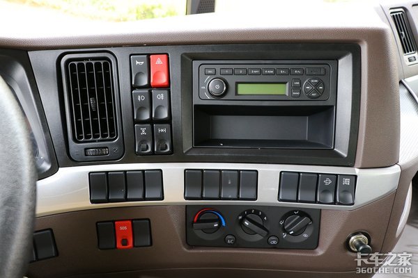 中控上包含了常用的按键以及空调、多媒体的控制系统,国六版本中特有的DPF再生按钮,另外也预留了很多按钮,方便卡友们后期加装其它设备。