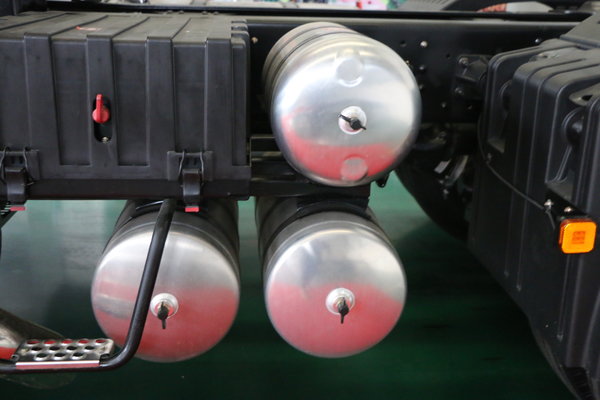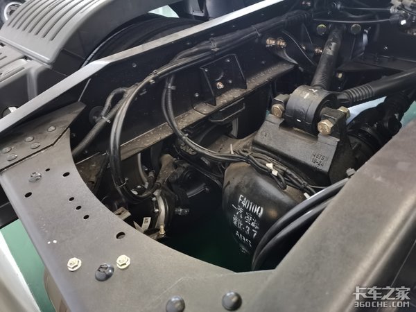 车架左侧放置了电瓶+3个储气筒。相信卡车司机都知道,小小储气筒可是有大作用,包括蓄能、过滤、稳压、降温等。