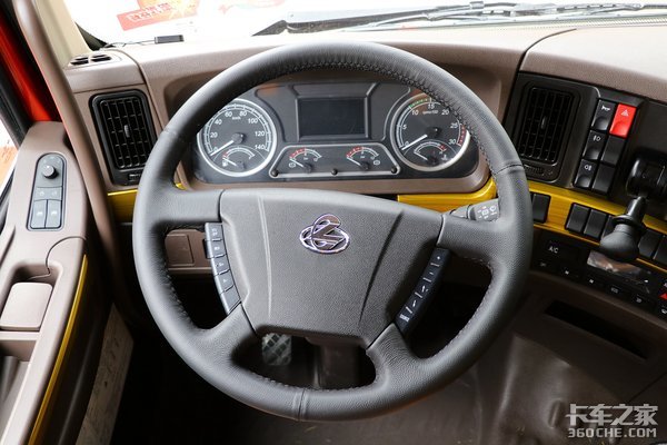 四副式多功能方向盘采用真皮包裹,左边排列的是定速巡航系统的按钮,右边排列的是多媒体的控制按钮,多功能方向盘也是如今中高端载货车上的常见的配置了。
