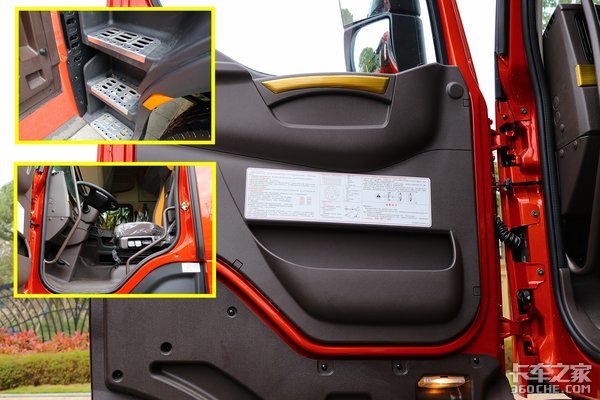 驾驶室门开近90度,三层镂空式蹬车踏板再加上设计合理的扶手,上下车非常方便,这种一段式扶手相比于两段式扶手更符合实际的使用习惯。