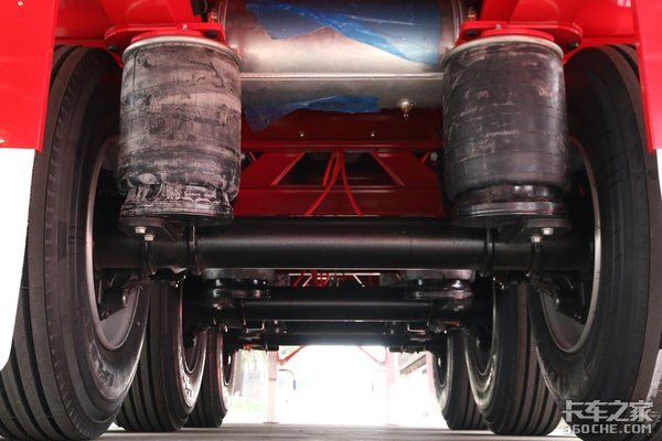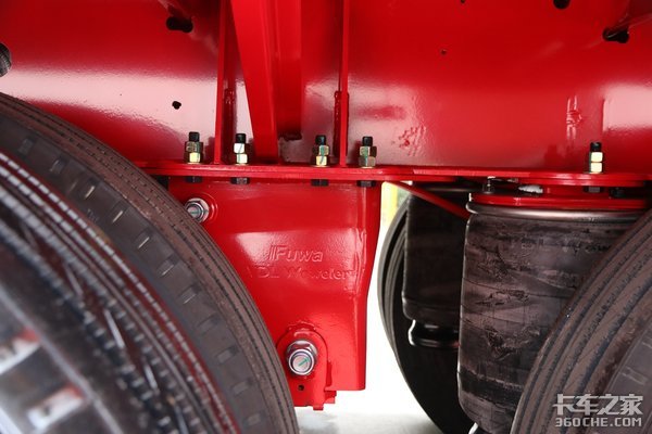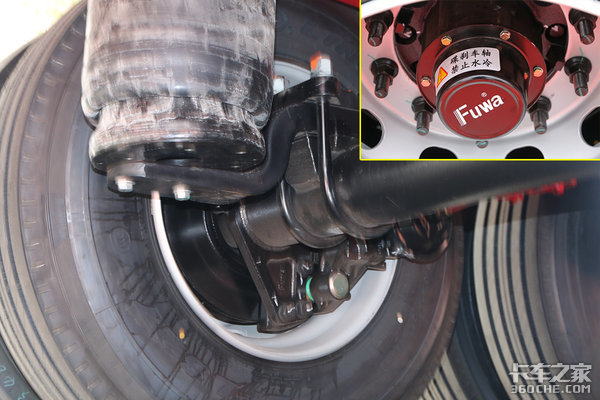 首先,车桥方面毫无疑问采用的是盘刹气囊桥。展车采用的是富华车桥,用户也可以选择BPW、华骏等品牌的车桥。