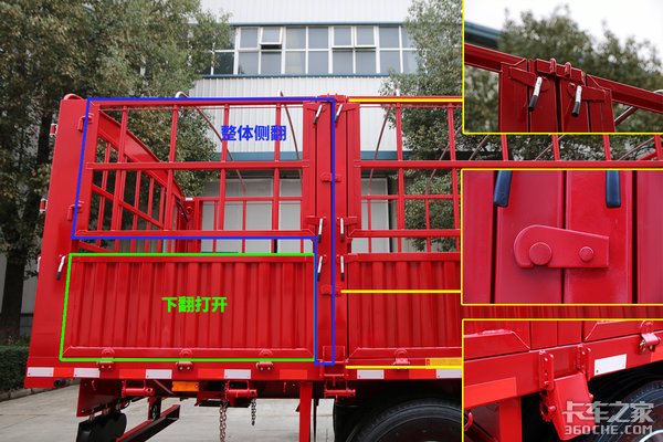 这样一来,在空间允许的情况下,打开所有厢门,可以快速装卸货物;在空间狭窄的区域,也可以单独下翻打开栏板,一样不耽误装卸货。并且中间分体的立柱上下均有固定装置,可以防止变形。