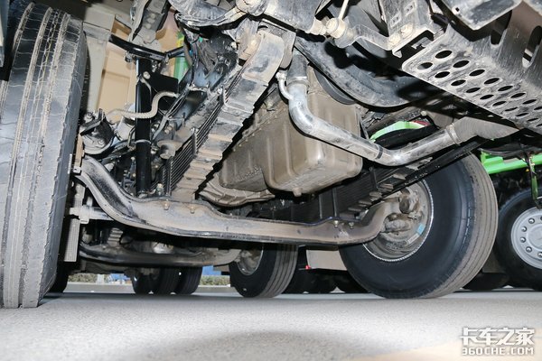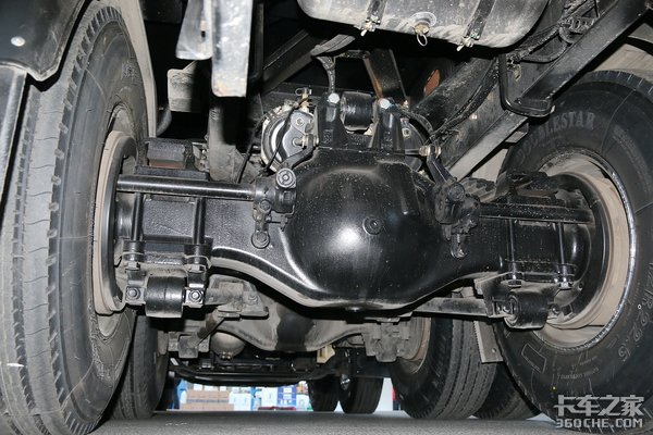 后桥则采用的是汉德MAN技术13T后桥,后桥速比为6.733,大速比后桥的设计可以满足整车在重载起步时所需的动力输出。