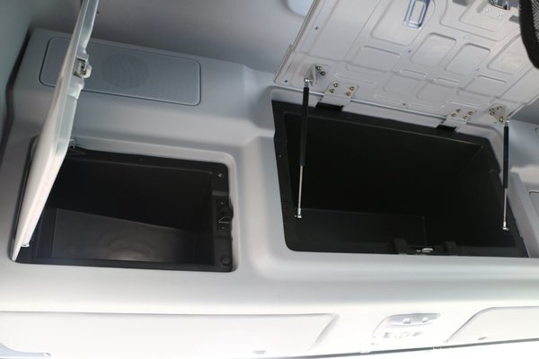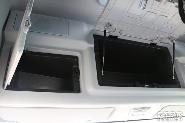 顶部的储物空间表现也相当不错,中间的大储物格有向内斜的防滑落设计,可放置被褥或者驾驶员冬天的衣物。