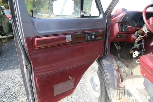 打开车门以后可以看到相当抢眼的红色车门内护板。除此之外,车门上的后视镜采用管状短镜臂,也是当年美国车的风格。该车车门未安装中控锁,使用了传统的插销锁。主副驾的车窗前半部分采用旋转开合通风式设计,从上图可以看到车门前半部分下方避开了车轮,如果设计整体式车窗肯定降不下来。