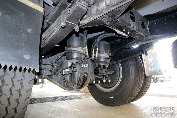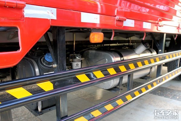 最后,咱们来看看整台车底盘布局,车身左侧为尿素罐以及油箱,油箱材质为铝合金,对于降低车身自重有一定帮助。