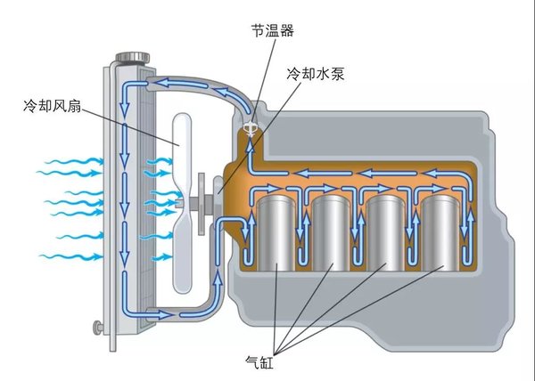 所谓大循环,就是除了在发动机内部的水道进行循环外,还要经过发动机外部的散热器,也就是我们俗称的水箱。