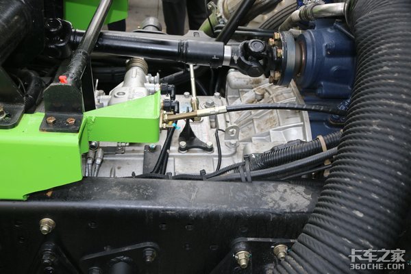 与之匹配的变速箱为法士特10JSD120T铝壳变速箱,这款变速箱的最大输入扭矩为1200N.m,头挡速比为14.96,最高挡10挡速比为1,直接挡传动效率更高。
