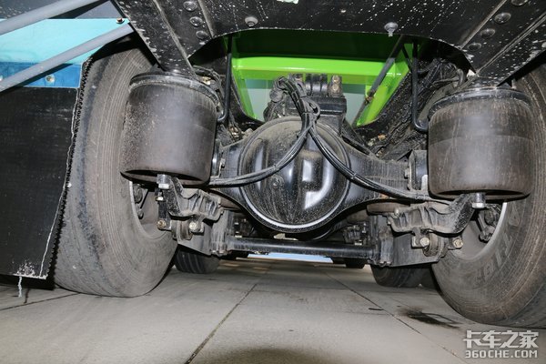 后桥采用的是汉德11吨MAN技术单级减速桥,后桥采用的是气囊悬挂,除了有限载总重多1吨的优势,气囊悬挂本身相比钢板弹簧自重更轻。