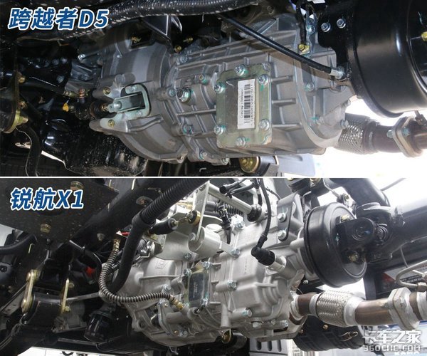 变速箱部分两者均有两款配置可选,并且有自身特色。实拍跨越者D5匹配的是来自万里扬的MW5G21五挡变速器,提供蒙沃五挡箱的版本。万里扬变速箱在小卡中很罕见,不过广泛用于轻卡,因此性能和售后都不需要太担心。实拍的锐航X1匹配蒙沃五挡变速箱,提供5T28五挡变速箱的版本,两个配置都有较高的市场普及率。