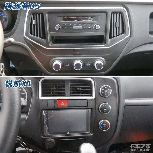 两台车的中控台是完全不同的设计风格,并且做工都有一定程度提高。跨越者D5沿用家族化的中控台造型,采用大量平直的线条,保留了自身的品牌特色。锐航X1中控台线条比较柔和,并且有流行的出风口杯架,但原创程度相对不高。