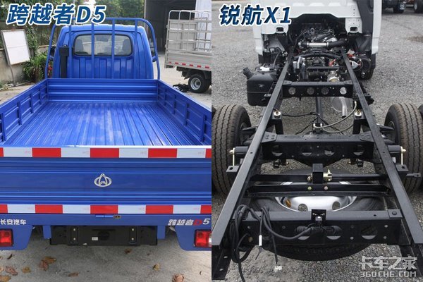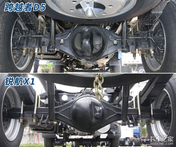 在底盘部分,两款车都采用直通大梁设计,搭配3吨级后桥,承载能力比较出色。钢板弹簧则略有不同,跨越者D5全系采用前4后5+3片钢板弹簧。而锐航X1有前6后7+6片和前3后5+3片的形式可以选择。