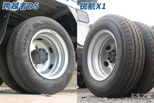 轮胎部分,跨越者D5采用海大牌轮胎,规格为185R15LT。锐航X1采用远路牌轮胎,规格185R14LT。