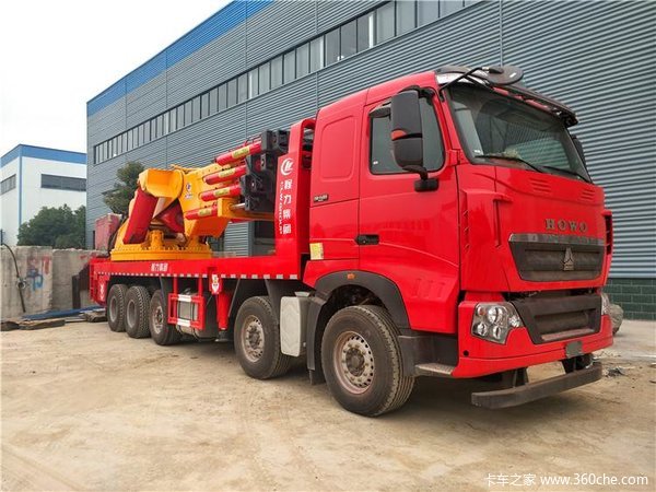春节期间在某地区遇到130吨级半折臂式随车吊,该车辆采用重汽HOWO T7H载货底盘,所装配的C7P系列平顶驾驶室及其下方特有的低位防钻入护杠确保工作场地的安全通过性。