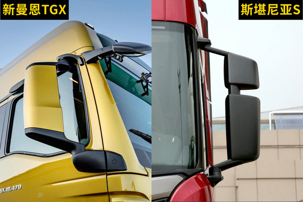 后视镜方面,斯堪尼亚S的后视镜采用分体式设计,可以选择喷漆外壳或者黑色塑料外壳;新曼恩TGX采用一体式设计,后视镜外壳采用喷漆涂装,看起来更高级。两款车都支持所有视镜电动调节、加热等功能。
