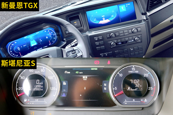 新曼恩TGX的仪表采用全液晶显示,科技感很强,非常炫酷;斯堪尼亚S则是机械指针与液晶显示屏相结合的款式,机械表内镶嵌显示屏,而且底色跟钢琴漆类似,很漂亮,质感很强。如果非要比较高低的话,斯堪尼亚的确更有设计感。