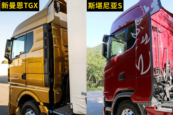 侧面视角,斯堪尼亚S系列整体的线条是前低后高,整个车头呈现出“俯冲”的气势,另外斯堪尼亚还可以选择狮身鹰面兽拉花;新曼恩TGX的侧面就比较稳重,相比上代车型卧铺窗看起来更灵活了,但是大体上依然走的是稳重风格。两款车的导流罩都可以折叠,方便驾驶员操作主挂车连接。