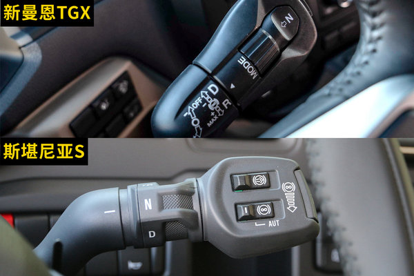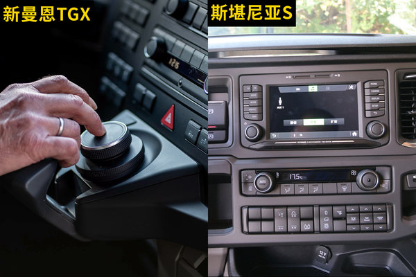 娱乐系统控制方面,新曼恩TGX设计了一个手托,这种设计在高档乘用车中才有,很上档次,应该也很舒服,并且曼恩配备了12.3寸的大屏幕;斯堪尼亚S依然是传统的操控方式,不过也不影响体验。从实际操控来说,两款车没有太大区别,但是从美观和档次角度来说,新曼恩TGX更好一点。