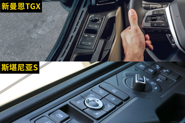 车门内衬板控制区域,新曼恩TGX上是控制中控锁、车窗和所有视镜调节的开关;斯堪尼亚S的集成度更高,还把大灯所有开关都布置在这个位置,不能说谁还谁差,只能说斯堪尼亚集成度更高,而新曼恩TGX操作起来更清晰。