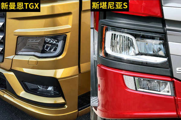 我们先来对比一下斯堪尼亚S和新曼恩TGX的外观造型。从整体来看,斯堪尼亚S的外观造型比较张扬,车头的线条以及整体的造型更偏年轻和运动;而新曼恩TGX的前脸风格比上一代车型要稳重,看起来很厚重,像一位沉稳的绅士。