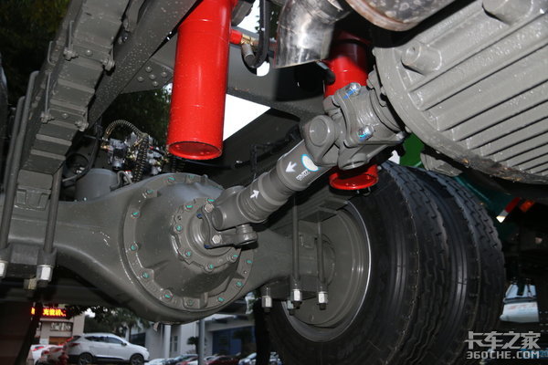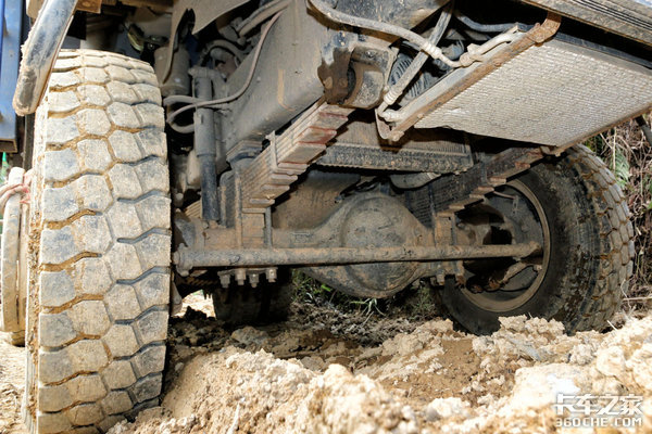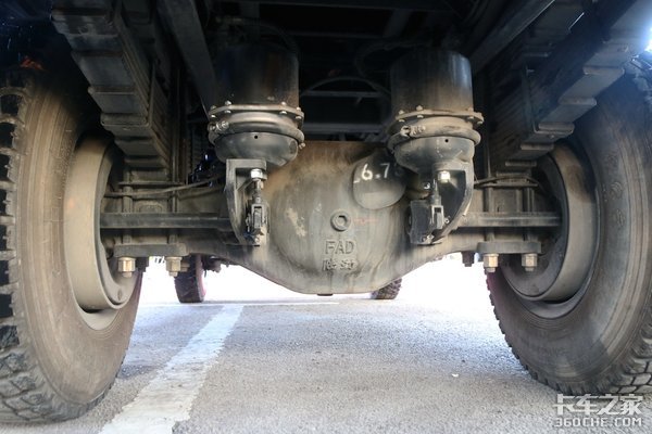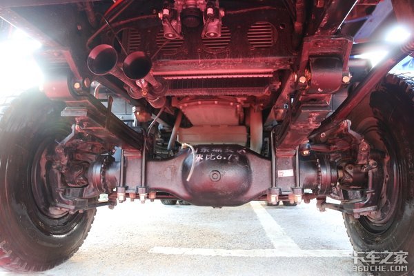 豪曼H3的前桥采用的是连盛驱动桥,采用轮边二级减速结构,能做到6.72的大速比,桥壳离地间隙也很大。整车采用前后9/11+8多片簧钢板悬架,前桥悬架重载完全无压力,因为在重载下坡时,前桥往往承受了巨大的压力,且前桥的轴头、半轴、牙包等也会容易损坏。