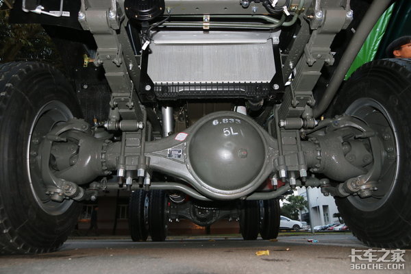 后驱动桥同样是轮减桥,速比6.72,带有差速锁。四驱上使前后桥刚性连接的是一体式分动器,通过这一装置达成车辆全驱效果,该分动箱还带有一个副箱,可以实现车辆陡坡缓降效果。为此,该车的4x4驱动加上差速锁的作用效果,能够应付国内绝大部分的山区路况,且能够在全天候全气候下工作。