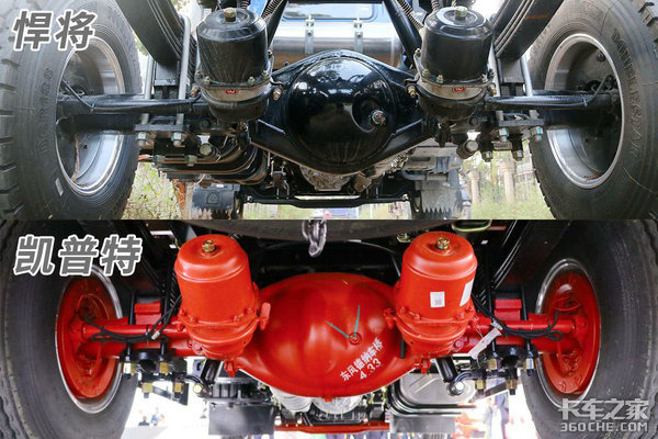 实拍凯普特采用5吨级别后桥,速比为4.33。公告中最高车速110km/h。前后桥少片簧设计,钢板弹簧数为3/3+3片。