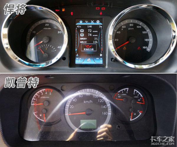 悍将的仪表盘采用双炮筒设计,辅以镀铬装饰,除了时速和转速外,大部分功能都通过显示屏显示。凯普特则延续了家族化设计,指针多达6根,在同级车中很少见,有自身品牌特色。