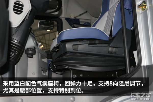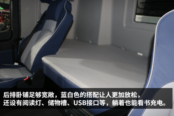 驾驶室布局条理清晰,主操控区、副操控区、生活区一目了然。内饰很多细节处理的非常不错,尤其是方向盘、座椅和卧铺的同款配色方案,让车内更有层次感和活力。