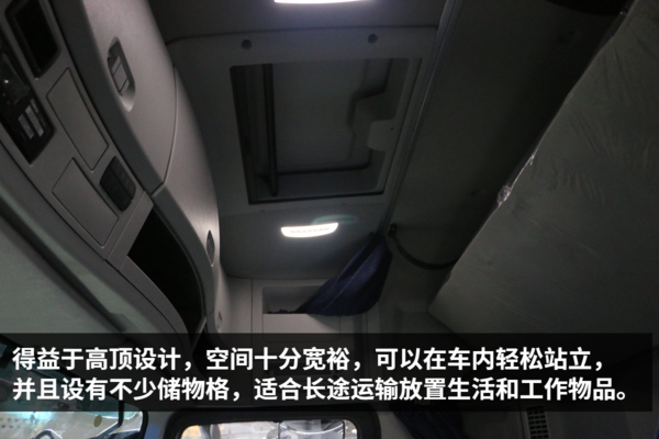 欧曼EST超级重卡采用高顶平地板驾驶室,空间上自然不用多说。驾乘人员可以在车内轻松的自由活动,站直腰杆随便玩。