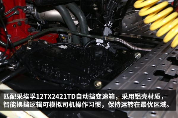 动力传递系统采用采埃孚12挡AMT铝壳自动变速箱。采埃孚变速箱质量可靠的特性早已被国人所熟知,该款变速箱除了拥有非常智能化的换挡逻辑之外,还可以通过学习驾驶员的操作习惯。通过监测车辆数据,让发动机运行在省油区域,从而降低油耗,来进行更好的动力衔接。