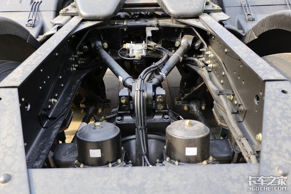 后桥部分配有V推杆,可以避免在行驶过程中后桥发生位移。另外,从这个图也可以看出来整个底盘布线非常整齐,捆扎也很到位,可以避免在行驶过程中因为车身晃动发生磨损,作为以军车起家的主机厂,陕汽的底盘装配工艺也非常扎实。